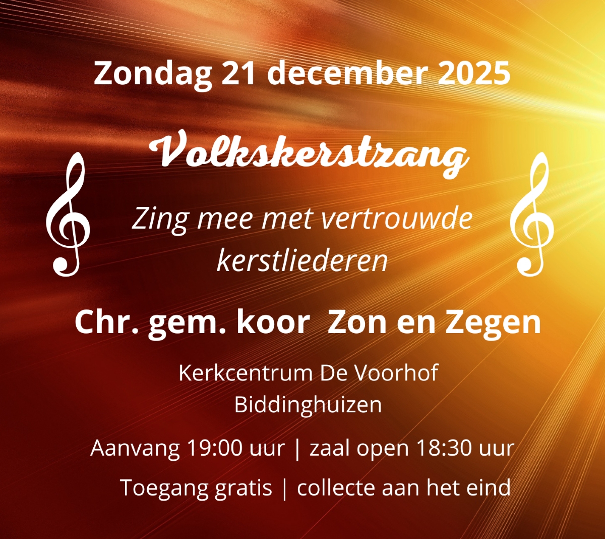 De jaarlijkse Volkskerstzang in Biddinghuizen is op zondag 21 december 2025.