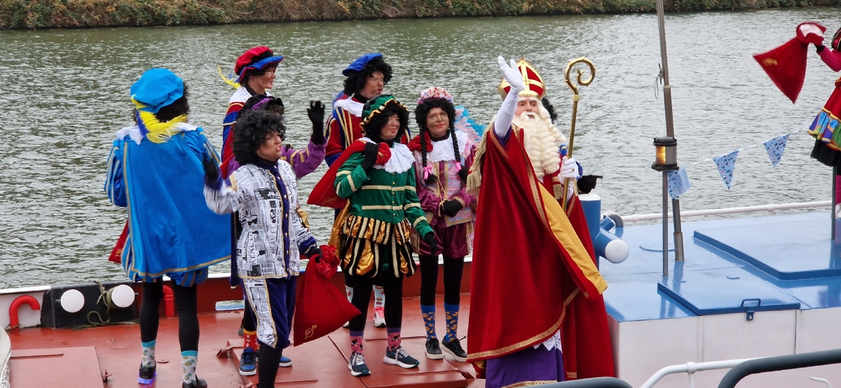 De stoomboot van Sinterklaas meert aan bij de Havenkade. Kinderen en ouders kunnen de Sint en zijn Pieten feestelijk verwelkomen met vlaggetjes en tekeningen.
