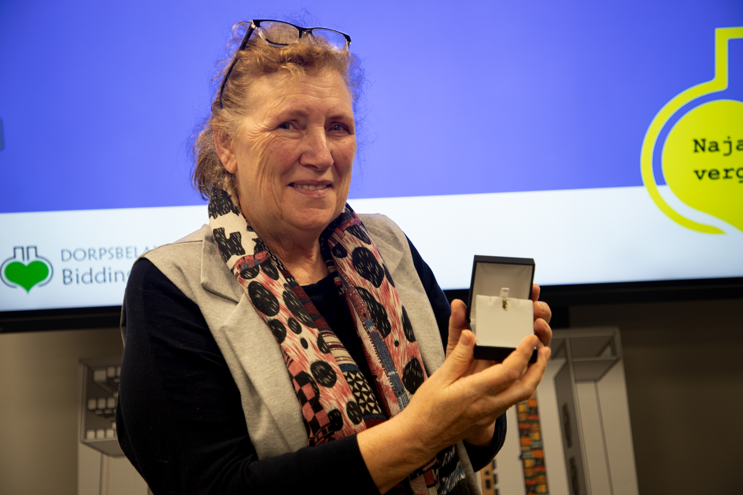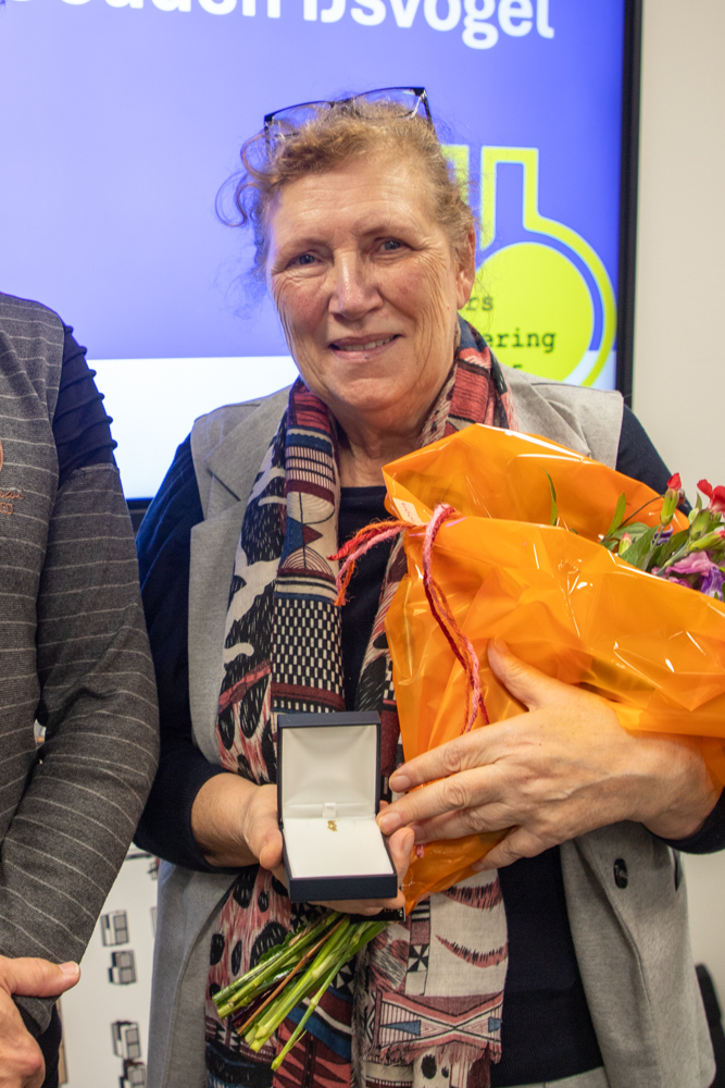 Donderdag 13 november 2025BIDDINGHUIZEN - Dorpsbelangen Biddinghuizen draagt namens het dorp De Gouden IJsvogel 2025 op aan de vrijwilligers van Inloophuis De Kans. Voorzitter Joris Heemskerk reikte de erespeld met het dorpslogo tijdens de Najaarsvergadering uit aan Janny van den Bos. 'We kennen het via jou als boegbeeld toe aan al die vrijwilligers die al die jaren hebben klaargestaan voor anderen.'