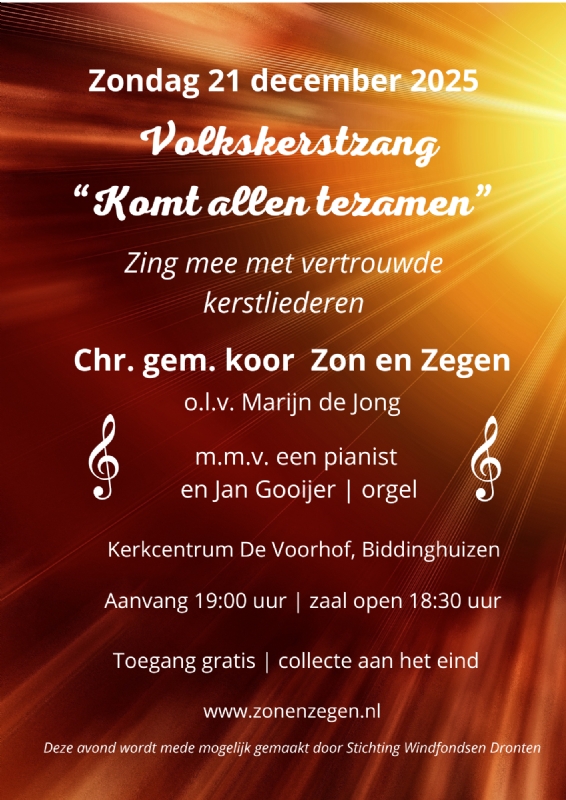 Maandag 1 december 2025BIDDINGHUIZEN - Samen meezingen met en luisteren naar vertrouwde kerstliederen op zondagavond 21 december a.s.. Dat is waar het koor Zon en Zegen iedereen ook dit jaar voor uitnodigt. Op de laatste zondagavond voor Kerst is er de traditionele Volkskerstzang in de kerk in Biddinghuizen.