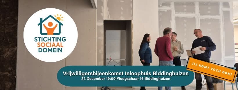 Maandag 8 december 2025BIDDINGHUIZEN - Het Inloophuis Biddinghuizen houdt op maandag 22 december om 19.00 uur een bijeenkomst voor mensen die overwegen vrijwilliger te worden bij het inloophuis. De bijeenkomst vindt plaats aan de Ploegschaar 16 in Biddinghuizen.