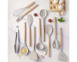 Breng stijl en functionaliteit in je keuken met deze 12-delige siliconen keukengerei set met houten handvatten. Deze hoogwaardige kookset is ontworpen voor dagelijks gebruik en biedt alles wat je nodig hebt om heerlijke maaltijden te bereiden. Dankzij het gebruik van hittebestendige en krasvrije siliconen blijven je pannen beschermd en gaat het gerei lang mee. De set bevat onder andere een opscheplepel, spatel, pastalepel en een handige garde. Elk stuk is BPA-vrij, veilig voor gebruik op anti-aanbakpannen en gemakkelijk schoon te maken. De houten handvatten geven een elegante uitstraling en blijven koel tijdens het koken. Met de praktische opbergkoker houd je je keukengerei altijd georganiseerd en binnen handbereik. De koker heeft een afwatergat onderin, waardoor hij ook gemakkelijk schoon te maken is. Voordelen van de set: Hittebestendig tot 230°CBPA-vrij en krasvrijDuurzaam en anti-aanbakMakkelijk schoon te maken, ook in de vaatwasserInclusief stijlvolle opbergkoker Inhoud van de set: RVS tangOpscheplepelPastalepelTurner en Turner met sleufSpatel en Spatel met sleufSoeplepelInsmeerborstelGardeGesloten toursOpbergkoker met afwatergat Deze keukenset is een must-have voor iedere keukenliefhebber. Verkrijgbaar in een stijlvolle siliconen uitvoering in khaki kleur, ideaal als cadeau of om jezelf mee te verwennen!