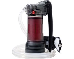 De MSR Guardian Purifier is een waterfilter waarmee je vanuit elke bron water kunt filteren. Dit waterfilter is oorspronkelijk ontworpen voor het leger, dus het kan wel tegen een stootje. Of je nu aan een beekje in de Alpen, een meer in Guatemala of de Mississippi River staat, de Guardian Purifier kan elk beetje water extraheren en het reinigen om het drinkbaar te maken. Om het apparaat te gebruiken plaats je de buis in de vloeistof die je wilt zuiveren, pompt met de bijgevoegde hendel, en de Guardian pompt het in een container of drinkfles je er aan draait. 100% bacteriën en 99,9999% virussen worden tegengehouden. Mocht je als extraatje nog een zuiverings-oplossing willen toevoegen doe je dit per liter water met 5 druppels zuiverings-oplossing. De Guardian werkt snel en gemakkelijk en is zelfreinigend, waardoor je niet steeds het filter hoeft schoon te boenen.