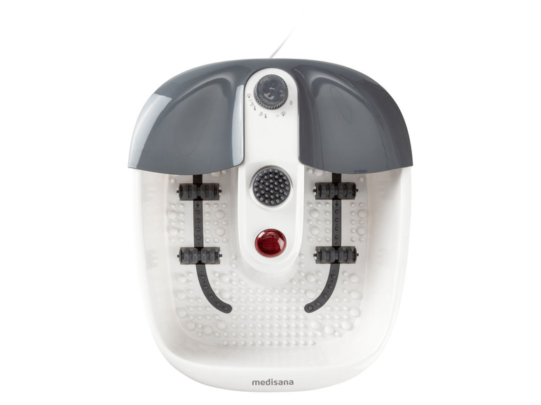 Dit voetbubbelbad is ideaal voor een ontspannende bubbel- en vibratiemassage. Het bad is voorzien van sfeervol rood licht en een waterwarmhoudfunctie. Met 3 verwisselbare pedicure-opzetstukken (eeltverwijderaar, borstel, massagekop). Massagerollen voor voetreflexologie. Massage-ondersteunend voetbed. Droge massage-functie. Antislipvoetjes van rubber. Afneembaar spatscherm. Afmetingen ca. 34,5 x 18,7 x 40,5 cm . Bubbel- en vibratiemassage. Pedicure opzetstukken: 3 stuks, verwisselbaar