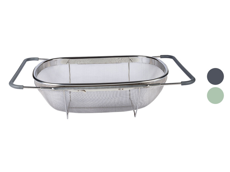 Deze vergiet heeft een traploos uittrekbare rand, waardoor deze op gangbare gootstenen past van ca. 35 tot 56 cm. De vergiet is gemaakt van. RVS en is vaatwasmachinebestendig. Verkrijgbaar in 2 verschillende kleuren: Grijs. Turquoise. Materiaal. RVS, kunststof. Afmetingen 35-56 x 24 x 11 cm (l x b x h). Gewicht 500 g . . Materiaal: RVS. Vaatwasmachinebestendig: ja. Afmetingen: ca. 35-56 x 24 x 11 cm (l x b x h)