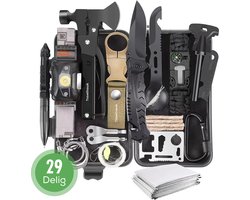 Met deze complete, lichtgewicht maar oersterke set ben je voorbereid op elke denkbare noodsituatie—van een onverwachte stroomstoring tot een avontuurlijke trektocht in de bergen. Dankzij de slimme selectie van 29 onmisbare tools heb je altijd het juiste gereedschap bij de hand. Voor Noodgevallen Of je nu verdwaalt in het bos, vastzit met je voertuig, of te maken krijgt met extreme weersomstandigheden – deze survival kit is ontworpen om jou en je gezelschap te helpen in kritieke situaties. Inclusief een 8-1 Spork, Hakbijl, reddingsdeken, vuurstarter en meer: alles wat je nodig hebt om te overleven tot hulp arriveert. Voor alle situaties Van kamperen en hiken tot bushcraft en stedelijke noodgevallen – de Travelhawk kit is veelzijdig inzetbaar. Elk item is gekozen met functionaliteit en gebruiksgemak in gedachten. Denk aan een tactisch mes, Hoofdlamp, kompas en multifunctionele kaarttool. Ideaal voor avonturiers, reizigers én preppers. De all-in-one Survival kit Geen losse uitrusting meer zoeken: deze 29-delige set bevat alles in één compacte, draagbare case. Hierdoor heb je alles direct bij de hand, overzichtelijk en goed beschermd tegen stof en water. Past moeiteloos in een rugzak, auto of noodpakket. Voordelen: Compact en lichtgewicht: Gemakkelijk mee te nemen zonder extra ballast. Volledig uitgerust: Van EHBO tot vuur maken en navigatie – je hebt het allemaal. Voor beginners én experts: Ideaal voor iedereen die veiligheid serieus neemt. Handige opbergcase: Stevige waterdichte behuizing met veilige sluiting. Perfect cadeau: Voor outdoorliefhebbers, avonturiers of als noodvoorbereiding. Robuuste kwaliteit Alle onderdelen zijn gemaakt van hoogwaardige en duurzame materialen, zoals roestvrij staal en aluminiumlegering. Ontworpen om tegen een stootje te kunnen en langdurig gebruikt te worden, zelfs onder de zwaarste omstandigheden. Specificaties Aantal onderdelen: 29 Inhoud o.a.: Tactisch mes Kompas Hoofdlamp (batterijen niet inbegrepen) Reddingsdeken 8-1 Spork Firestarter Touw en visgerei Multifunctionele toolkaart Paracord-armband Waterdichte opbergbox Afmetingen case: ca. 17 x 11 x 5 cm Gewicht: ca. 550 gram