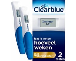 Clearblue Zwangerschapstest Met WekenindicatorVertelt je of je zwanger bent en hoeveel weken sinds de bevruchting: 1-2, 2-3 of meer dan 3 weken * Bepaalt de duur van de zwangerschap even nauwkeurig als een echo-onderzoek (1) * Vroeg testen: uitslag 5 dagen voor je gemiste menstruatie (4 dagen voor de dag waarop je menstruatie zou moeten beginnen) (3) * Clearblue is veruit het nauwkeurigst: Clearblue is meer dan 99% nauwkeurig bij het detecteren van zwangerschap vanaf de dag waarop je menstruatie zou moeten beginnen * Onmiskenbaar duidelijke digitale uitslag in woorden, binnen 3 minuten * Het Nr. 1 merk in verkoop wereldwijd (gegevens beschikbaar)