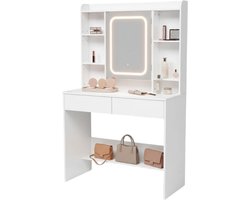 Monza Home® Kaptafel met Spiegel en LED-verlichting Met Instelbare Helderheid – Make Up Tafel Met 2 Laden – 4 Planken – Wit