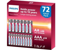 Philips Power alkaline batterijen De Philips Power alkaline batterijen 72-pack is een complete en krachtige oplossing voor al je dagelijkse stroombehoeften. Met maar liefst 48 AA- en 24 AAA-batterijen is dit pakket perfect voor gezinnen, kantoren, en....