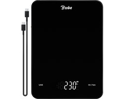 Nooit meer zoeken naar batterijen nét als je wilt bakken. Deze Broba keukenweegschaal oplaadbaar heeft een ingebouwde accu die je eenvoudig oplaadt met USB-C. Het strakke zwarte glas, het heldere LED-display en de snelle, nauwkeurige meting zorgen ervoor dat jij ontspannen kunt koken, bakken en koffie zetten – elke dag opnieuw. Keukenweegschaal digitaal tot 10 kg – strak, stabiel en duidelijk Deze keukenweegschaal digitaal weegt van 5 gram tot 10 kilo, in stappen van 1 gram. Het ruime glazen plateau (22 × 16 cm) biedt plaats aan kommen, pannen en ovenschalen, terwijl de antislip dopjes de weegschaal stevig op je aanrecht houden. Het LED-display licht helder op, zodat je het gewicht in één oogopslag ziet, ook als je kom wat uitsteekt. Precisie weegschaal voor elke thuisbakker Deze Broba is een ideale precisie weegschaal voor brood, cake, koekjes en hartige gerechten. Je schakelt met de UNIT-knop tussen g, lb:oz, oz, ml en ml milk, zodat je ook buitenlandse recepten moeiteloos volgt. Het gewicht stabiliseert na een paar seconden en blijft even rustig staan op het display, zodat je geen cijfers hoeft te lezen terwijl je tegelijk aan het schenken bent. Perfect als koffie weegschaal voor je slow coffee ritueel Serieuze koffieliefhebbers gebruiken een koffie weegschaal – en met deze Broba gaat dat heel eenvoudig: Weeg koffiebonen of gemalen koffie nauwkeurig per gram Zet je kopje, server of dripper op de weegschaal en gebruik TARE Schenk water tot je exacte koffie-/waterratio bereikt is Zo wordt jouw pour-over, AeroPress of mokkapot geen gok, maar een herhaalbaar recept. Keuken weegschaal met tarra-functie en helder LED-display De tarra-functie maakt deze keuken weegschaal extra handig: Plaats je lege kom op de weegschaal Druk op TARE – het display springt terug naar nul Voeg één voor één je ingrediënten toe Je weegt alles in één kom, zonder rekenwerk en met minder afwas. Het LED-display laat duidelijk zien wat er op staat, en de weegschaal schakelt na ongeveer 2 minuten automatisch uit om energie te besparen. Keukenweegschaal oplaadbaar met USB-C – nooit meer batterijen kopen Twijfel je tussen een model op batterijen of een keukenweegschaal oplaadbaar? Deze Broba heeft een ingebouwde 3,7V 250 mAh lithium-ion accu die je gewoon via de USB-C-poort oplaadt. Geen losse batterijen meer in huis nodig Altijd klaar voor gebruik na een korte oplaadbeurt Duurzame keuze: minder batterijafval Zet de schakelaar aan de onderkant op ON, en je weegschaal is klaar om te wegen. Bestel jouw Broba keukenweegschaal oplaadbaar en maak van elk bakmoment een ontspannen, precies en smaakvol ritueel – van brood en taart tot je dagelijkse kop koffie.