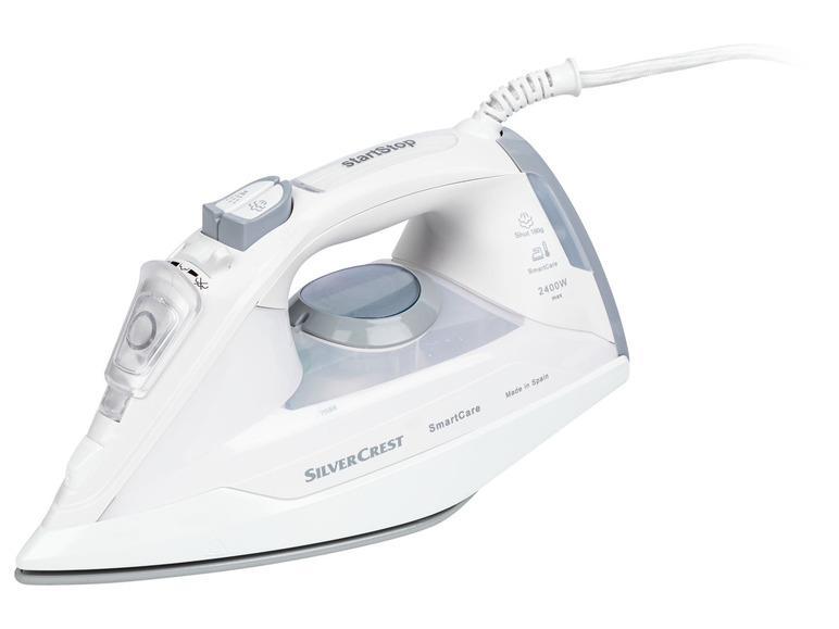 SILVERCREST® stoomstrijkijzer, 2400. W. Eigenschappen. Krachtig vermogen van 2400 watt voor vlekkeloze strijkresultaten. Met hoogwaardige keramisch beklede strijkzool voor optimale glijeigenschappen. Variabel instelbare permanente stoom (Vario-stoom) tot 40 g/min. maakt altijd de juiste stoomhoeveelheid mogelijk. Krachtige stoomstoot voor het gemakkelijk gladstrijken van dikke stoffen en hardnekkige kreuken. Verticale stoom voor het opfrissen en lichtjes gladmaken van hangend textiel en gordijnen. Sproeifunctie voor het bevochtigen van de kleding. Waterreservoir met een capaciteit van 320 ml voor een lange strijktijd. Anti-druppelsysteem voorkomt dat er water van de strijkzool lekt zelfs bij lage strijktemperatuur. Zelfreinigende functie voor verwijdering van kalkaanslag in het waterreservoir. Korte opwarmtijd voor snelle gebruiksklaarheid 360° draaibare kabel. Hoge veiligheid door oververhittingsbeveiliging en automatische uitschakeling. Technische gegevens. Inhoud: 320 ml.
